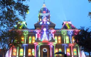 *We’ll take time out for a Holiday Buffet at Theo’s and then watch as the Courthouse comes alive with thousands of pulsating lights synchronized to holiday music! The majestic 1881 building is the backdrop for 36 animated light displays, with 15,000 lights outlining the building.