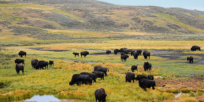 Day Six: Depart for the Grand Tetons on a driving tour with many panoramic photo ops along the way. Keep your eyes peeled for eagles, buffalo, and bear… exciting! You’ll love the breathtaking view during lunch in the Mural Room at Jackson Lake Lodge. Then we enter our country’s 1st National Park, est. in 1872, YELLOWSTONE!! You’ll be free to explore the “Old Faithful” area with plenty of time to see eruptions at this natural “Wonder of the World” spanning over 2M acres ~ 2 Nights in West Yellowstone. (B,L)